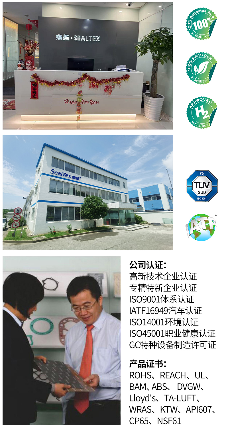 SealTex上海一柯索拓密封材料有限公司長(cháng)期致力于各行業(yè)用100%無(wú)石棉環(huán)保密封墊片和耐高溫隔熱產(chǎn)品的生產(chǎn)及銷(xiāo)售,作為高新技術(shù)企業(yè)和專(zhuān)精特新認證單位,參與國家多項與密封墊相關(guān)的標準制定,可協(xié)助客戶(hù)進(jìn)行密封失效分析如面壓測試和有限元分析,密封墊的設計與選擇。公司通過(guò)ISO9001、IATF16949、ISO14001 、ISO45001體系認證并取得GC特種設備制造許可證。工廠(chǎng)坐落于上海松江工業(yè)園區,擁有各種加工設備,實(shí)現從原材料復合到精密模切的垂直生產(chǎn)體系。