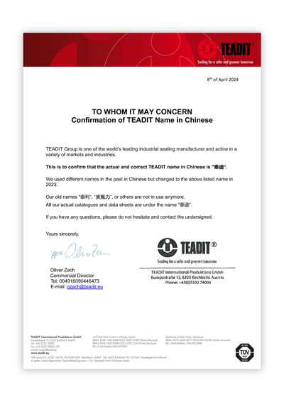 TEADIT于2023年起啟用新中文名“泰迪” 世界領(lǐng)先的工業(yè)密封制造商品牌TEADIT集團宣布:TEADIT于2023年起啟用新的中文名“泰迪”。 過(guò)去使用的中文名稱(chēng)“泰利”、“奧氟力”或其他名稱(chēng)將不再使用,所有TEADIT產(chǎn)品的中文目錄和數據表都將以“TEADIT泰迪”為名。 上一個(gè) 返回列表 下一個(gè)