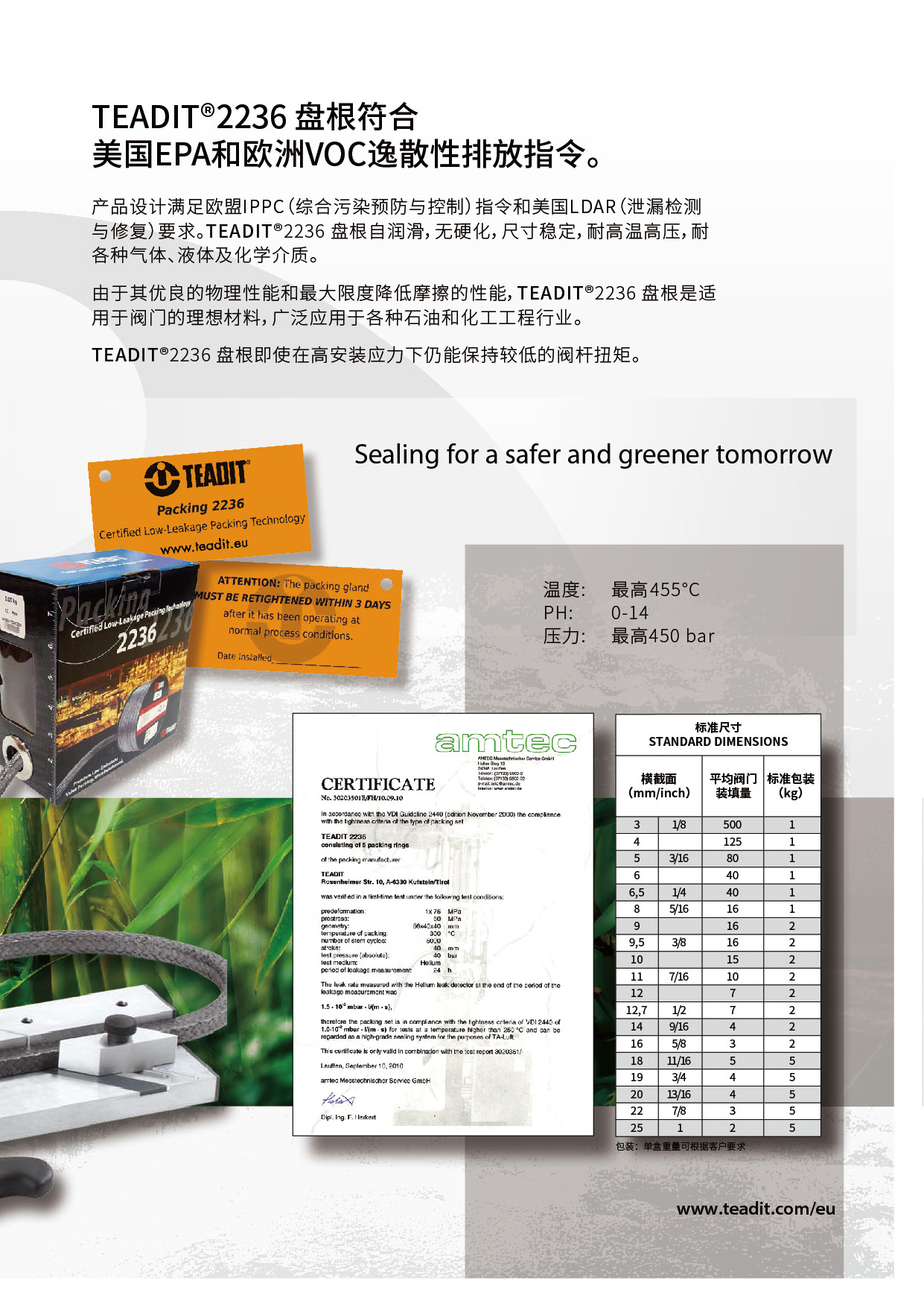 TEADIT® 2236 盤(pán)根具有自潤滑、非硬化、尺寸穩定、耐氣體和流體、耐熱、耐壓和耐化學(xué)腐蝕等特性。它的高溫柔性石墨和 Inconel® 長(cháng)絲護套具有機械穩定性,先進(jìn)的結構可在蒸汽服務(wù)中實(shí)現泄漏控制和高完整性。產(chǎn)品設計滿(mǎn)足歐盟IPPC(綜合污染預防與控制)指令和美國LDAR(泄漏檢測與修復)要求。