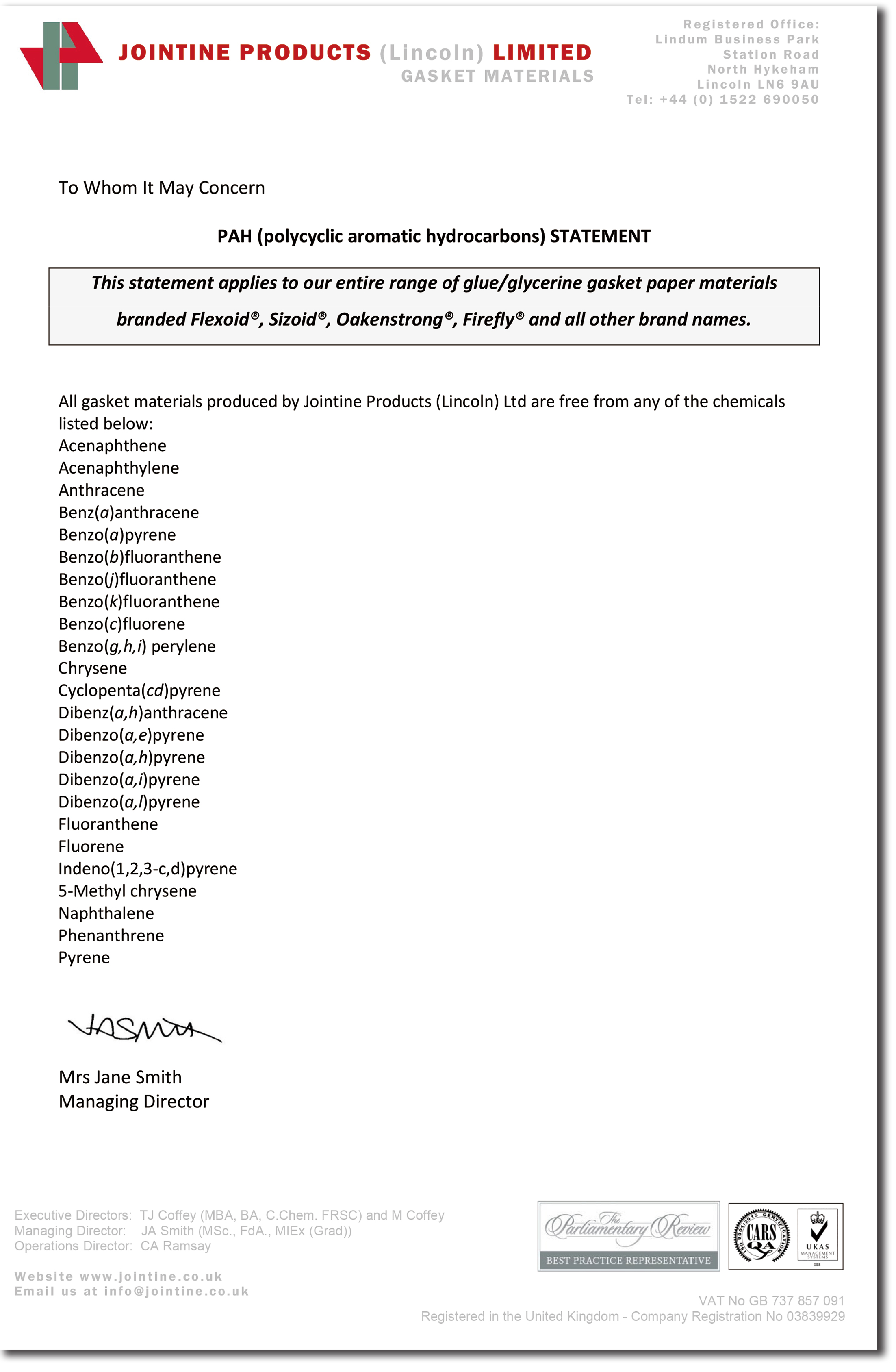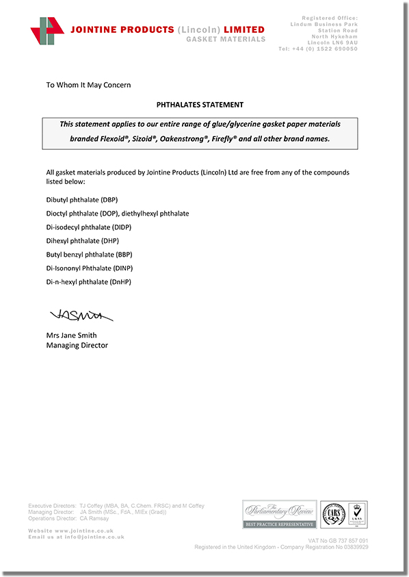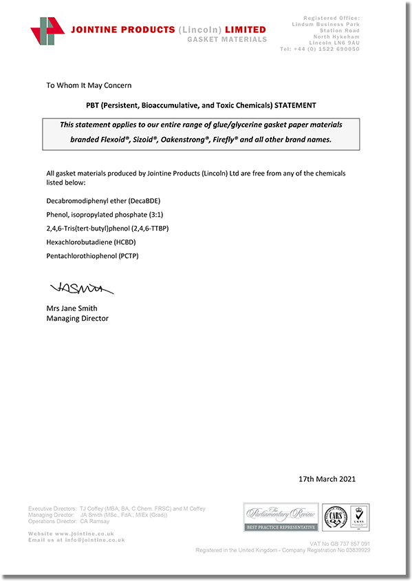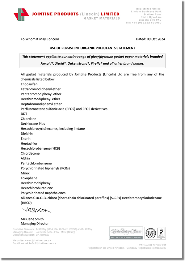 JOINTINE是全球領(lǐng)先的高質(zhì)量耐油植物纖維紙墊片材料制造商,其名下的品牌產(chǎn)品Flexoid/福來(lái)德、Cranflex是一種環(huán)保的耐油纖維紙墊片材料,可廣泛應用于汽車(chē)、發(fā)動(dòng)機、傳動(dòng)設備等行業(yè),如下是JOINTINE發(fā)布的環(huán)保聲明函。